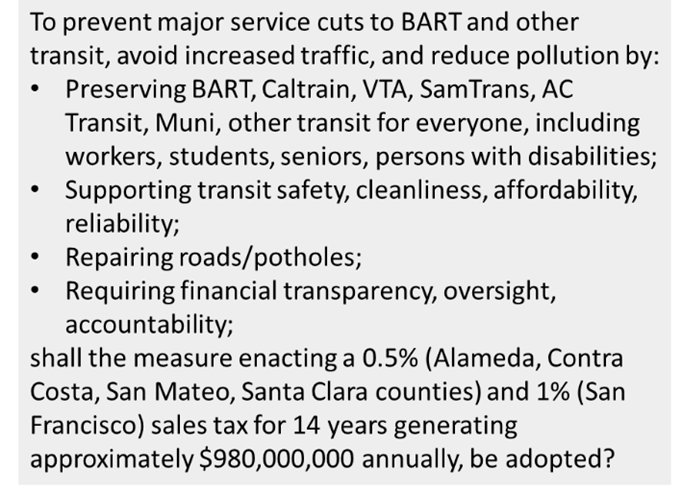 The regional sales tax increase on the Nov. 2026 ballot will be “sold” to voters, especially in Santa Clara County, as a “repair roads/potholes” ballot measure. Transit will be a “secondary” (or non-existent) issue in the sales pitch to voters in Santa Clara County.